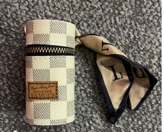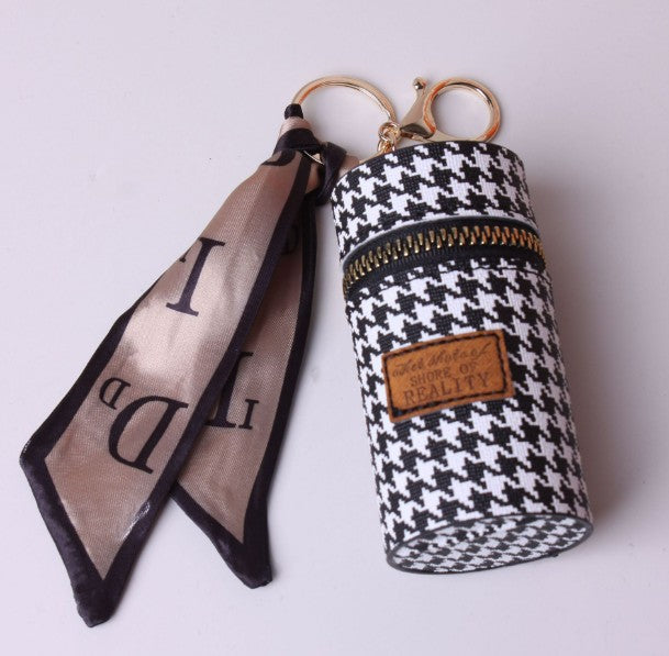 Product information : Material: PU Pattern: printing Luggage shape: cylindrical Lining material: polyester Number of wallet folds: None Color: plaid rice, plaid brown, plaid powder Size Information: Size: about 9*5cm Packing list: Coin purse *1