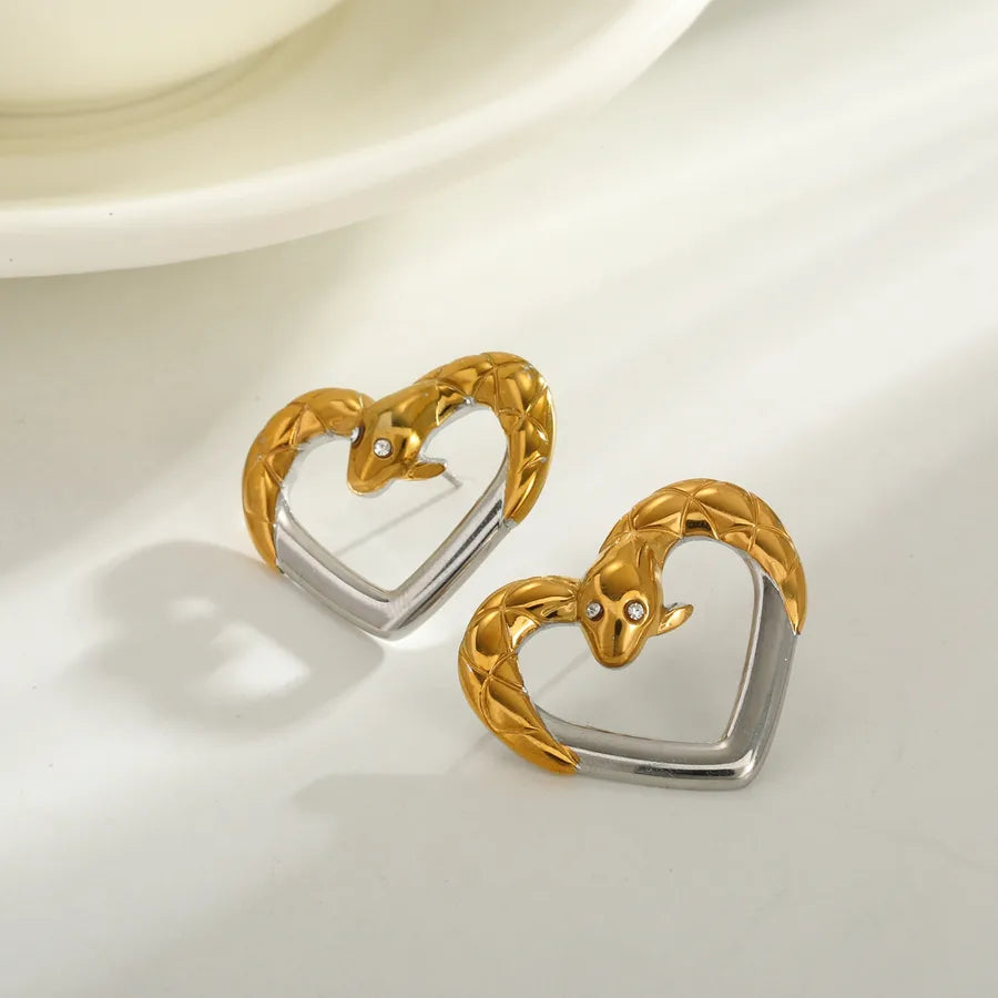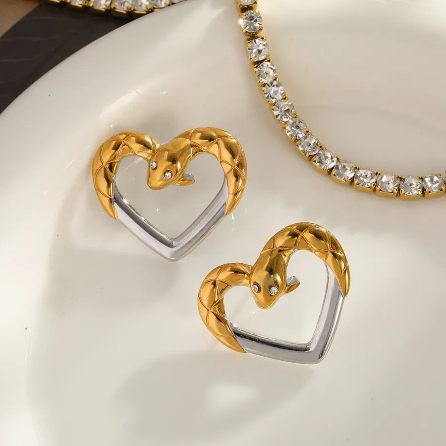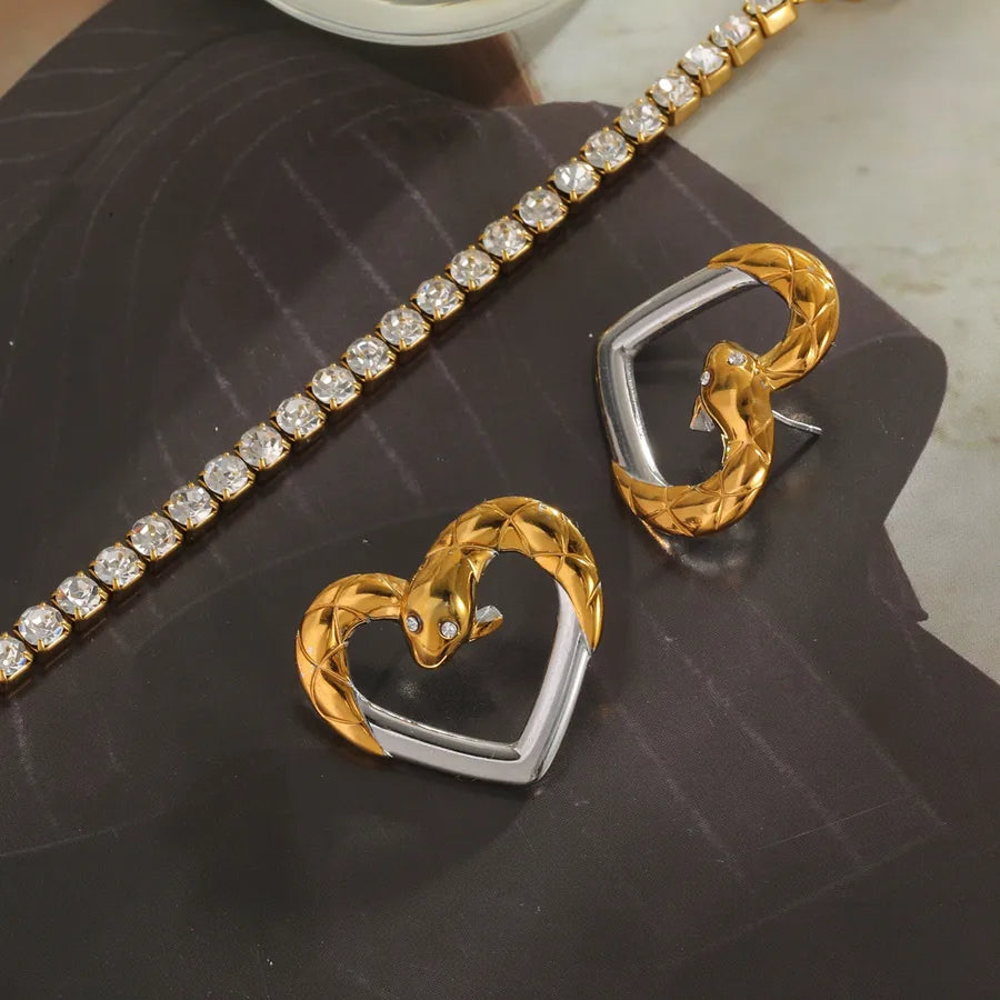 Vacuum Electroplating (In Furnace) Plated 18K Real Gold Love Heart Snake 304 Stainless Steel Zircon Casual Elegant Vintage Electroplating Inlaid Stud Earrings
